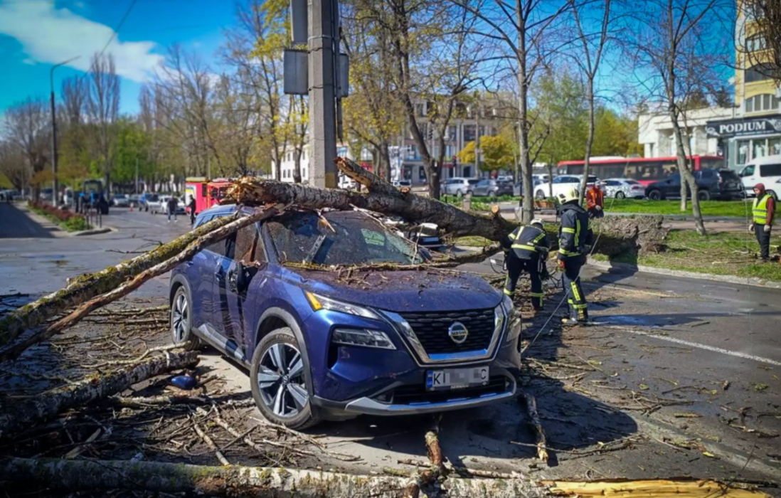 Під час ліквідації наслідків негоди рятувальники виявили одне пошкоджене авто. Сильний вітер звалив дерево, яке впало прямо на дах автівки. Внаслідок цього виникла пожежа: