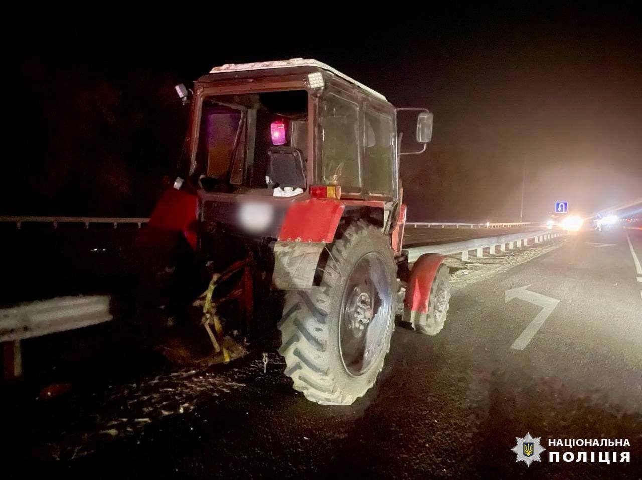 На 53 кілометрі траси 23-річний водій трактора при перелаштуванні у сусідню смугу руху не надав перевагу водієві Mazda. Внаслідок зіткнення від трактора відірвалась металева деталь, яка пошкодила попутний автомобіль Fiat.
