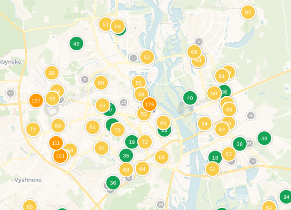 Після 18:00 в Києві переважають середні показники забруднення повітря. Також, за даними сервісу saveecobot, деякі з них перевищують допустимуть норму. Наразі найбрудніше повітря зафіксовано за такими адресами: