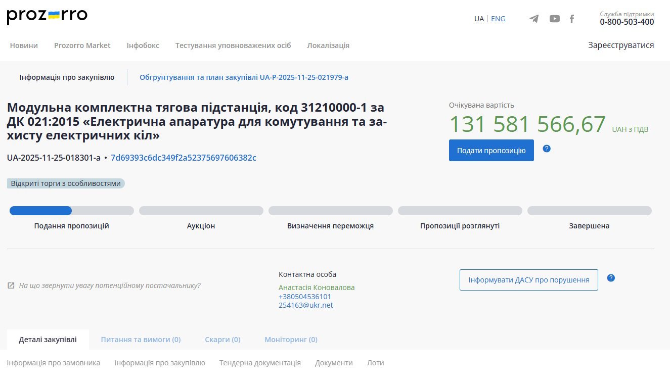 Комунальне підприємство «Київпастранс» оголосило тендер на закупівлю модульної комплектної тягової підстанції часів 2025 року за очікуваною ціною 131 581 566,67 гривень.