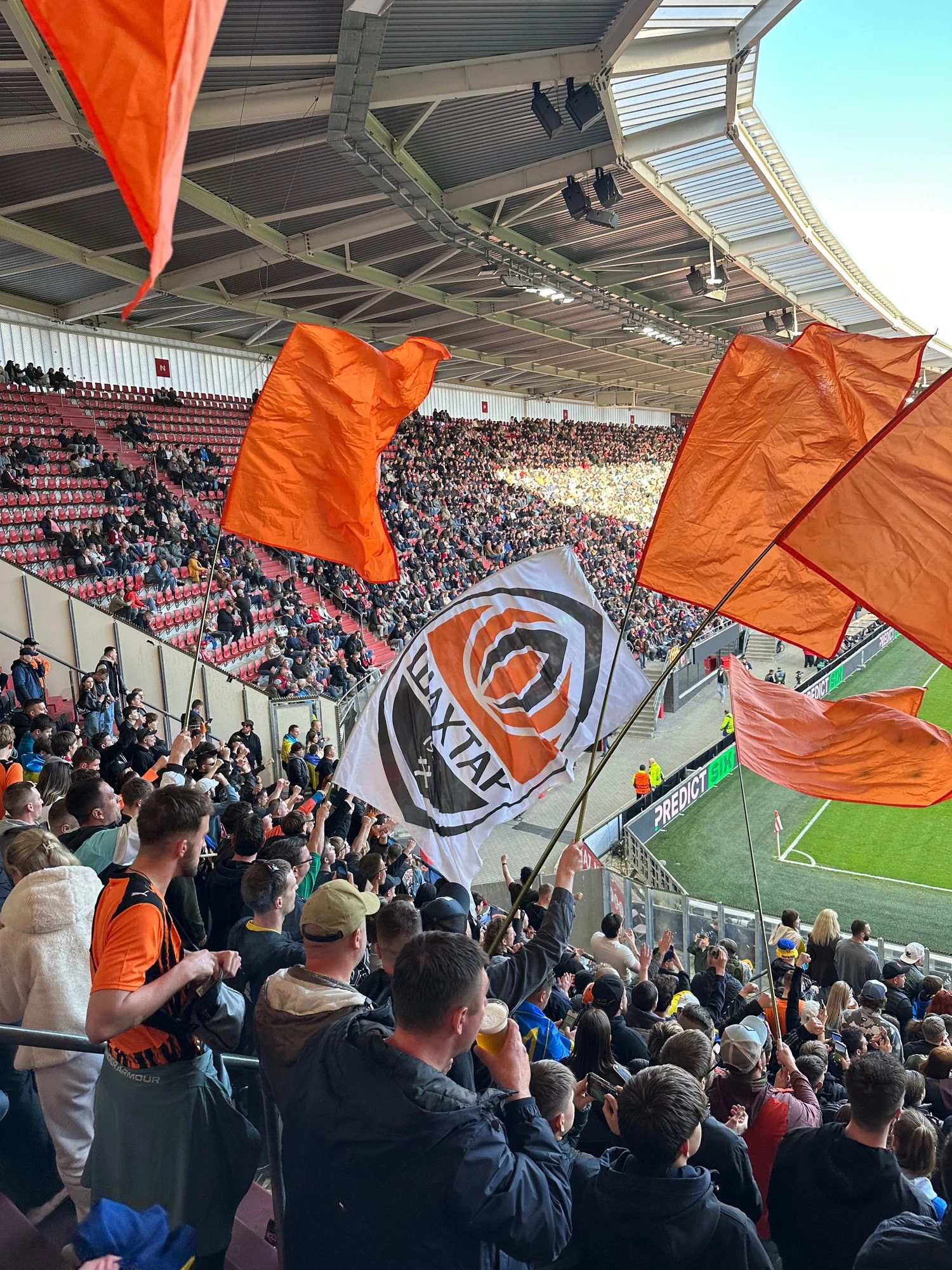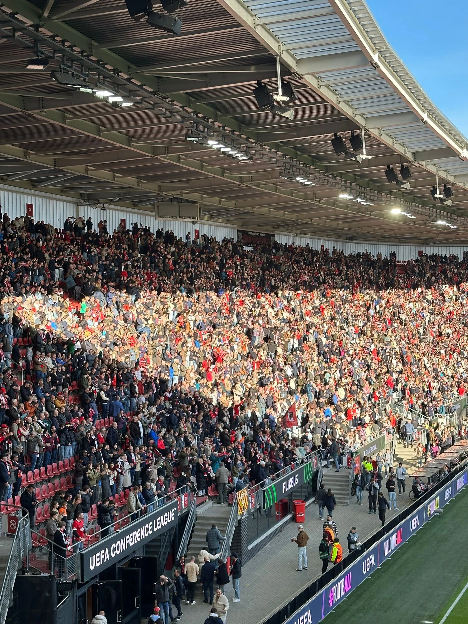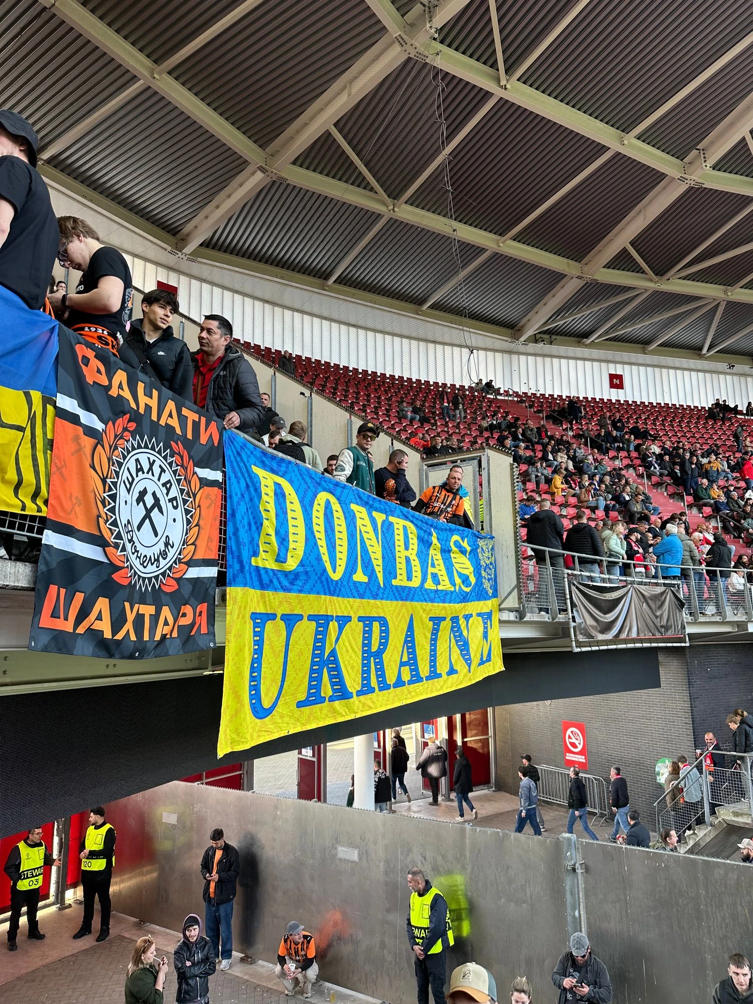 Ще задовго до стартового свистка біля арени в Алкмарі було чутно українські пісні, скандування та вигуки підтримки "Шахтаря". Попри статус виїзного матчу, гостьовий сектор був повністю заповнений. На трибунах майоріли українські прапори, прапори міст, шарфи клубу та символіка Донеччини.