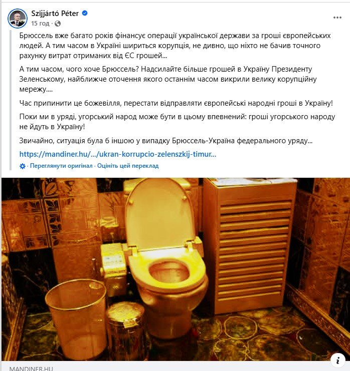В частности, министр иностранных дел Венгрии Петер Сиярто уже публично на своей странице в Фейсбук написал, что ЕС должен прекратить "отправлять деньги европейских граждан в Украину" в связи с коррупционным скандалом в энергетике.