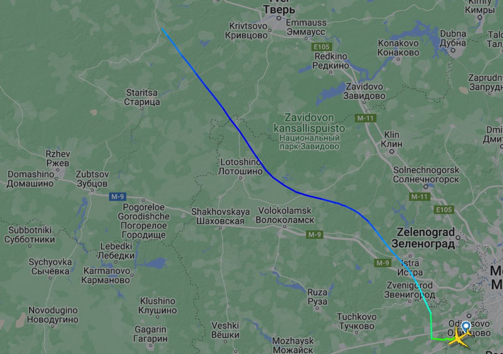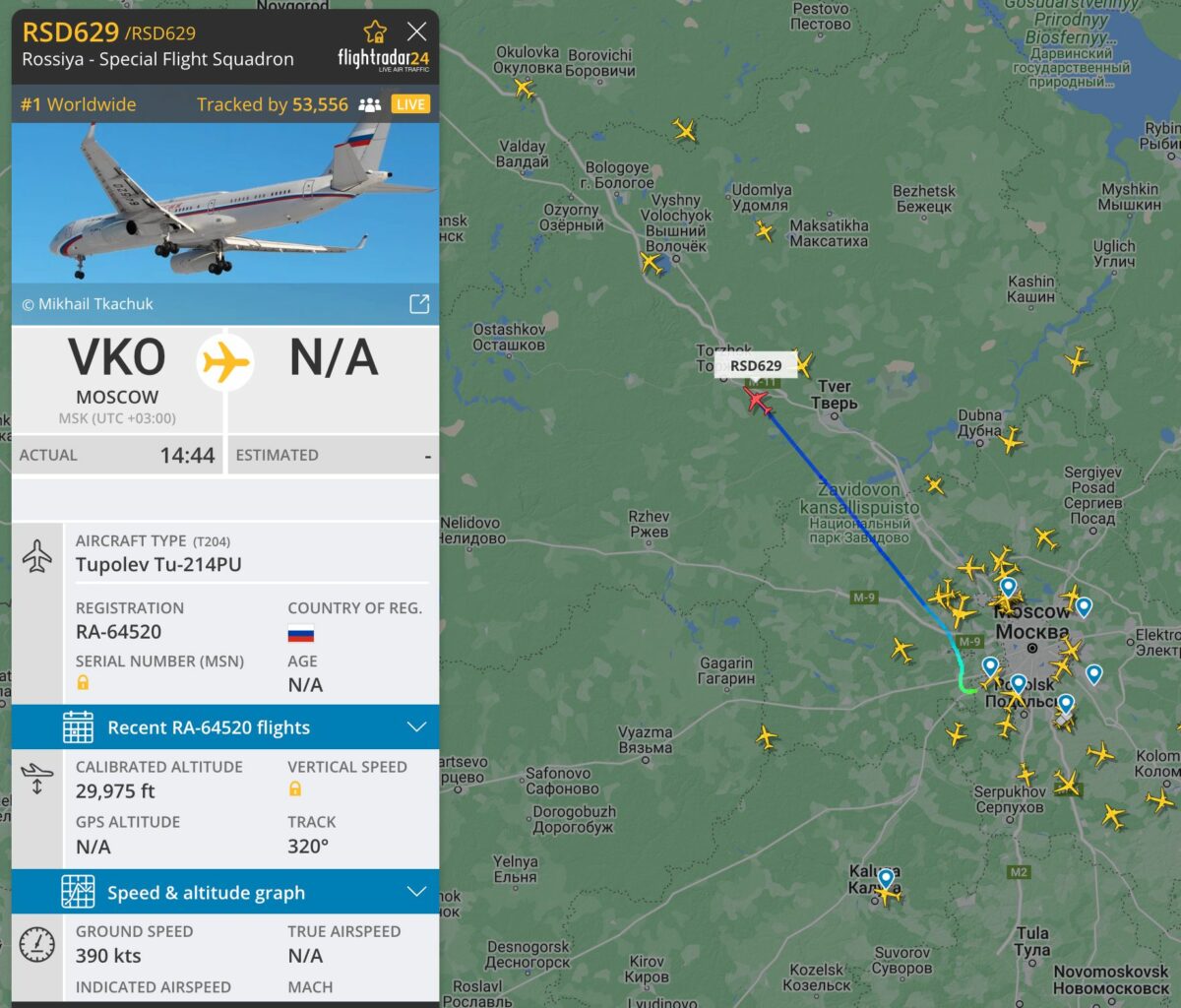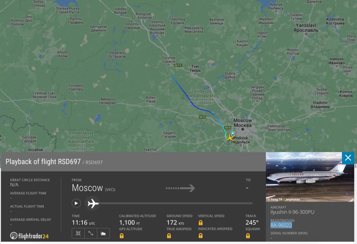 Как сообщает «Агентство. Новости«, в районе 14:15 из Москвы на северо-запад вылетел Ил-96 с бортовым номером RSD697 летного отряда «Россия», на котором раньше летал Путин. В районе 14:40 самолет, когда он находился к западу от Твери, примерно в 150 км от Валдая, перестал передавать координаты. Он выключил транспондер в районе Твери.