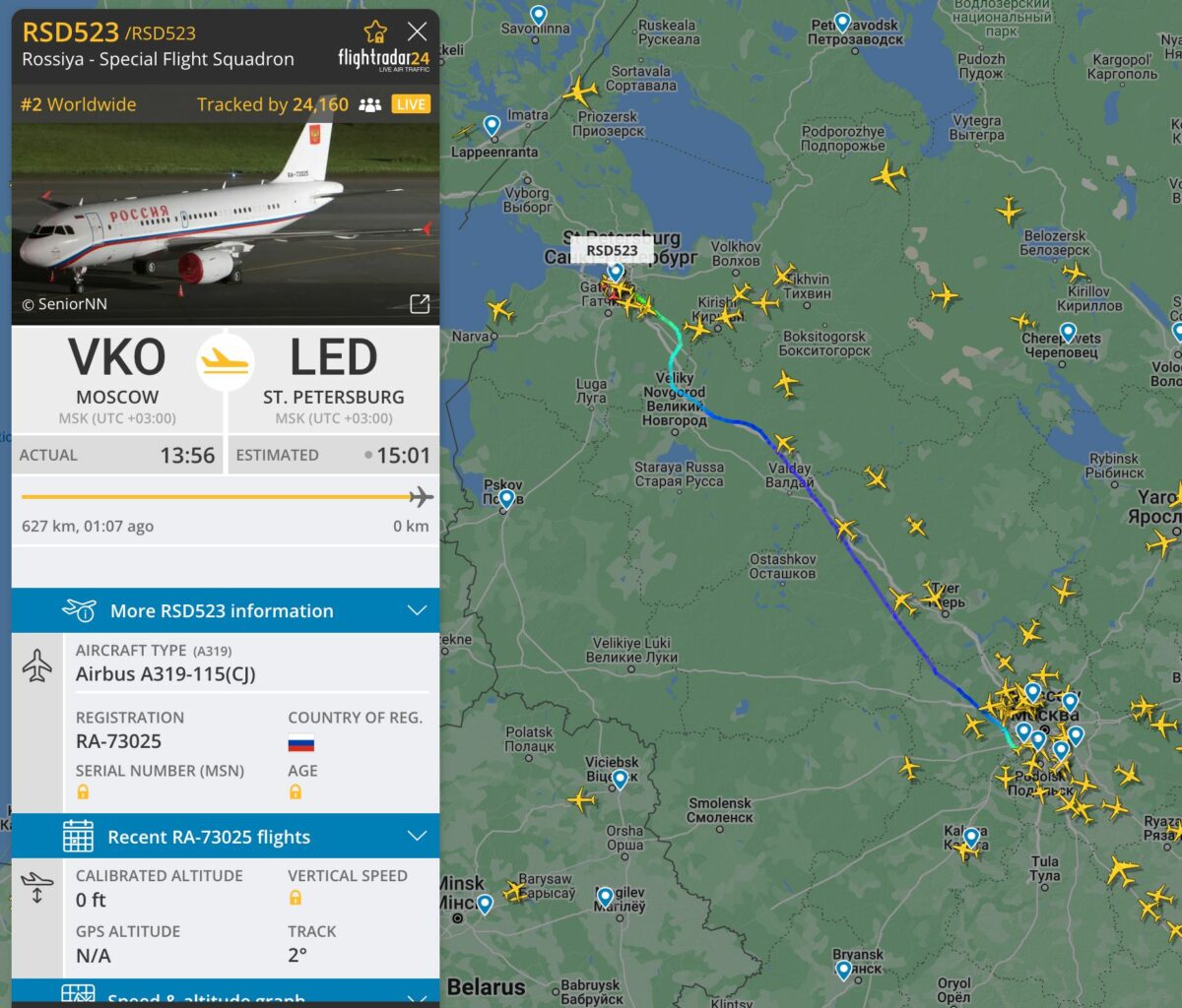 По данным The Insider, еще один борт спецотряда «Россия» RSD523 садится в Санкт-Петербурге.